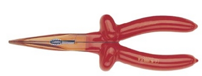 全身绝缘,包括工作区。 DIN / ISO 5745 铬钒钢材质,可在电压1000V以下带电工作。 钳尖45°向下倾斜,更适合分开乱线,夹缝孔中作业。 双材质手柄,握紧力更强,并带有保护设计。