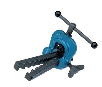 用于铜管、铝管、黄铜及软质钢管的扩口。 压铸锌机体,钳口为钢质。 开口角度90°与管子成45°。 配有管道切割器,铁盒装。