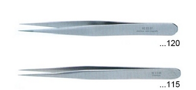 普通尖嘴镊子,用于夹持、安放和取出精密元器件。 弹簧钢材质。