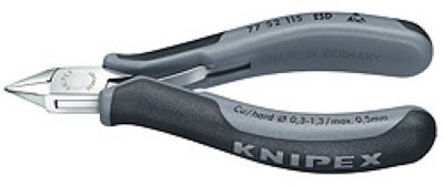 防静电;钳手柄采用双色双重材料手柄,黑色和灰色;型5:尖头扁嘴,小偏刃;长度115,头部镜面抛光,双色双重材料手柄