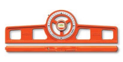 Sturdy aluminium die-cast design with milled measuring face. Surface with orange powder coating. Rotating vial body with % and degree scale to transfer inclinations. Length 50 cm.
