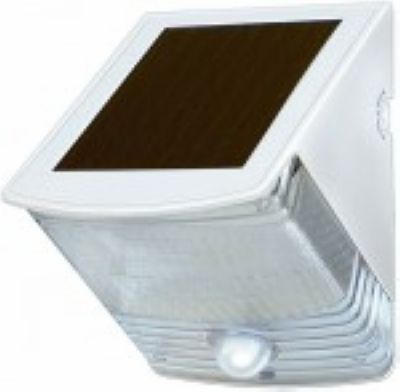 Compact solar lamp with integrated solar module and infrared motion detector.